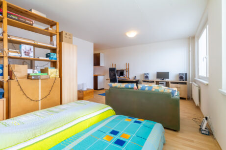 •Prostorný obývací pokoj s kuchyňským koutem a místem na spaní.